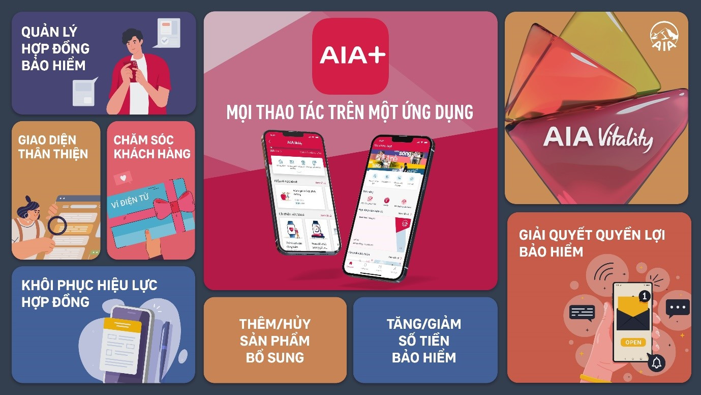 Với mục tiêu nâng cao trải nghiệm khách hàng trong mọi khía cạnh, vào tháng 2/2023, AIA Việt Nam đã cho ra mắt ứng dụng AIA+ với hàng loạt tính năng mới và thuận tiện. Ứng dụng này không chỉ là nền tảng quản lý hợp đồng bảo hiểm thuận tiện mà còn là một công cụ đa dịch vụ có nhiều tính năng, giao diện thân thiện dễ dùng với các tiện ích tuyệt vời như: Quản lý thông tin hợp đồng bảo hiểm, giúp khách hàng dễ dàng cập nhật thông tin hợp đồng; Cập nhật các chương trình chăm sóc khách hàng; Tái tục, duy trì hợp đồng; Cải thiện sức khỏe cùng Vitality, giúp khách hàng có thể theo dõi và cải thiện sức khỏe của mình thông qua tính năng Vitality; Giải quyết quyền lợi bảo hiểm, giúp quy trình giải quyết quyền lợi trở nên nhanh chóng và minh bạch.